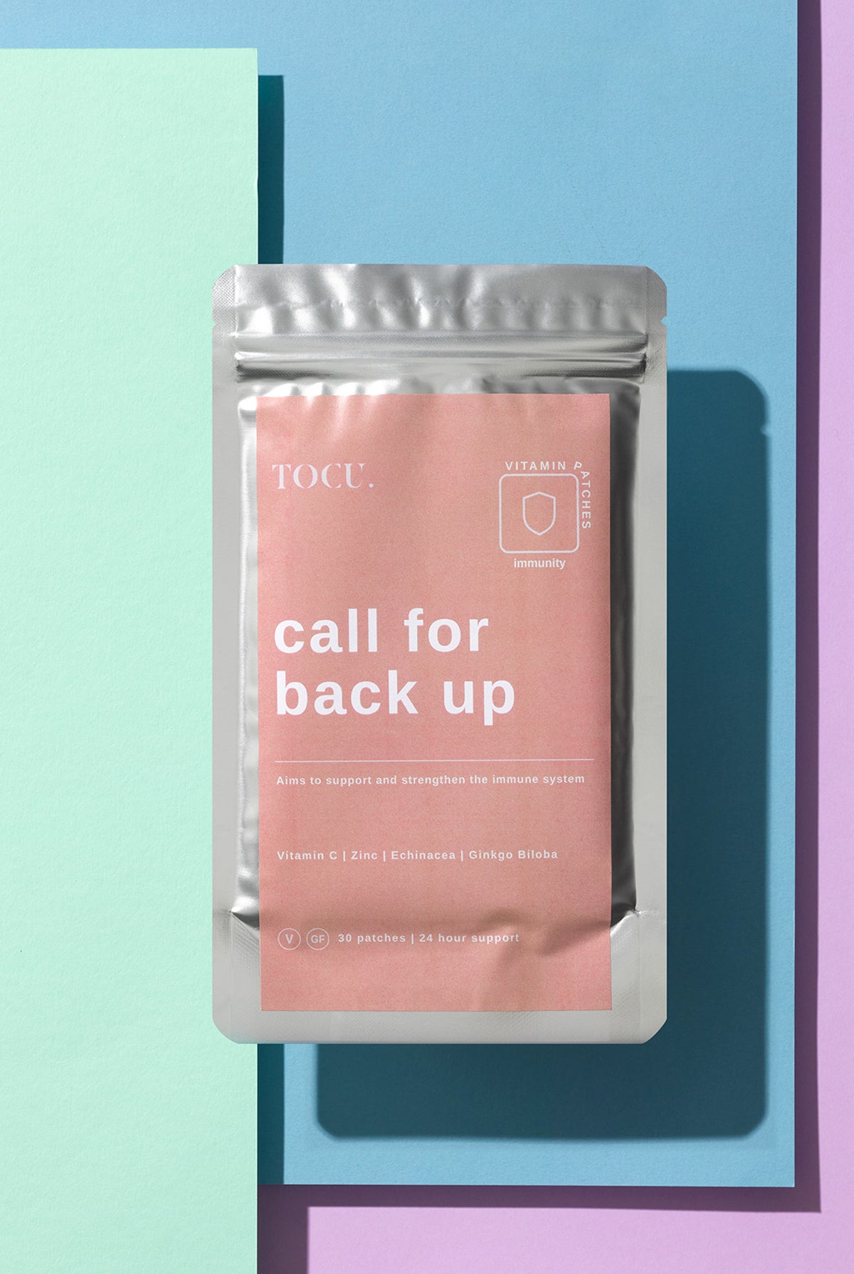 TOCU CALL FOR BACK UP VITAMIN PATCHES Call For Back Up aims to support and strengthen the immune system. This carefully formulated natural blend includes Vitamin C, Zinc, Echinacea and more to help promote immunity and aid recovery. Reinforcement is on its way. KEY INGREDIENTS + BENEFITS: Vitamin C May boost immunity and strengthen the skin’s defence system. Zinc Can help support immunity; deficiency can lead to a weakened immune system. Echinacea Studies have shown it may help the immune system combat infections and viruses, which may aid recovery. Ginkgo Biloba Contains high antioxidant and anti-inflammatory properties. May help improve circulation YOU MAY ALSO LIKE TO KNOW: UK manufactured Natural ingredients Easy alternative to tablets Hypoallergenic Discreet and easy to wear Vegetarian, vegan and gluten-free Pack contains 30 patches. INGREDIENTS Ascorbic Acid, Zinc acetate, Ginkgo Biloba, Echinacea HOW TO USE Apply one patch to a relatively hair-free area and replace at the same time every day. Do not exceed one patch per day. This patch is not a medicine, rather a carefully formulated natural blend. If side effects occur, stop using immediately. If you are pregnant, lactating or taking other medication, consult a medical professional before use.