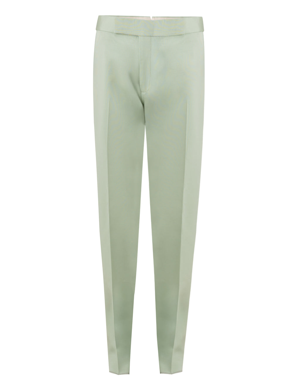 Pantaloni Eleganti Slim Tom Ford. In verde pistacchio, due tasche laterali a filetto e due tasche posteriori chiuse con bottoni, fascia in vita, chiusura con gancini coperti. Vestibilità slim, gamba stretta.Composizione: 100% ViscosaSKU Brand: PLZR01VRS02FG050SKU Interno: 25AP21