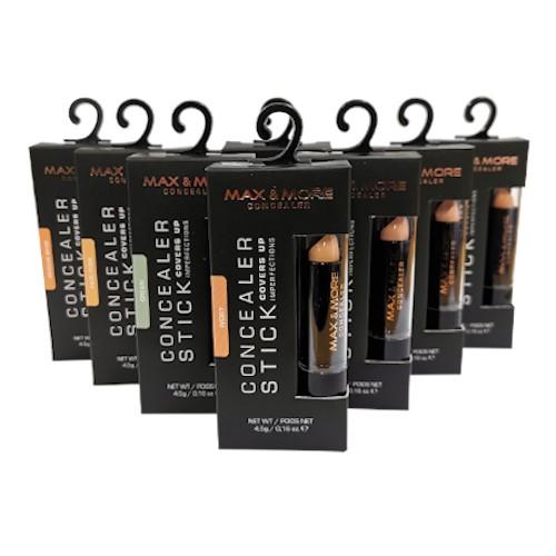 Cover imperfections for an even skin tone with Max & More’s Concealer Stick. Available in a range of shades, there’s something for every skin colour. Use it to correct dark circles around the eyes, large pores or blemishes before foundation, and seal with powder for perfection.. To use, simply dab the concealer on and around the area you wish to cover, then gently blend with a finger or blending brush. For dark circles around the eyes, choose a shade lighter than your natural skin tone.. 1 x 4.5g Max & More Concealer Stick. Available in: Fair-pink / Medium Beige / Light Beige / Deep Beige / Ivory / Greem. To remove use mild soap & water. Cruelty free