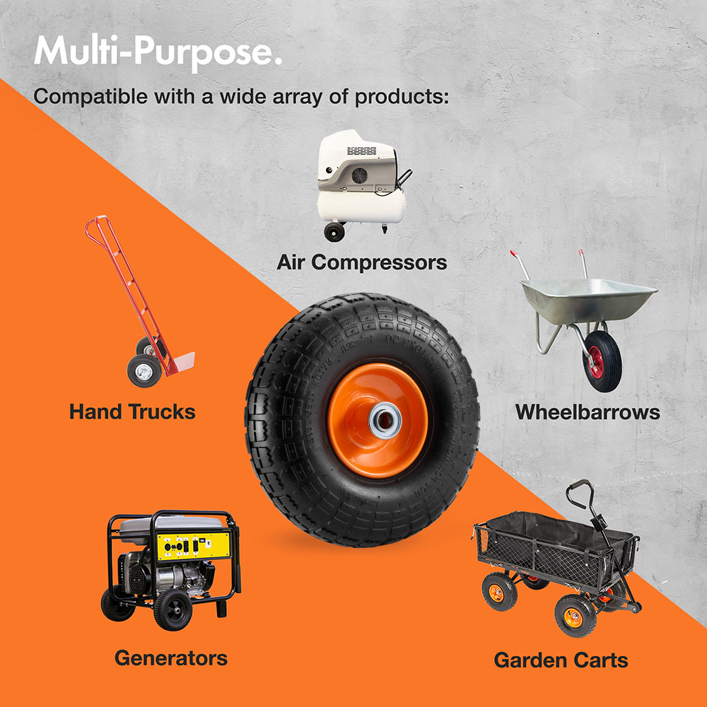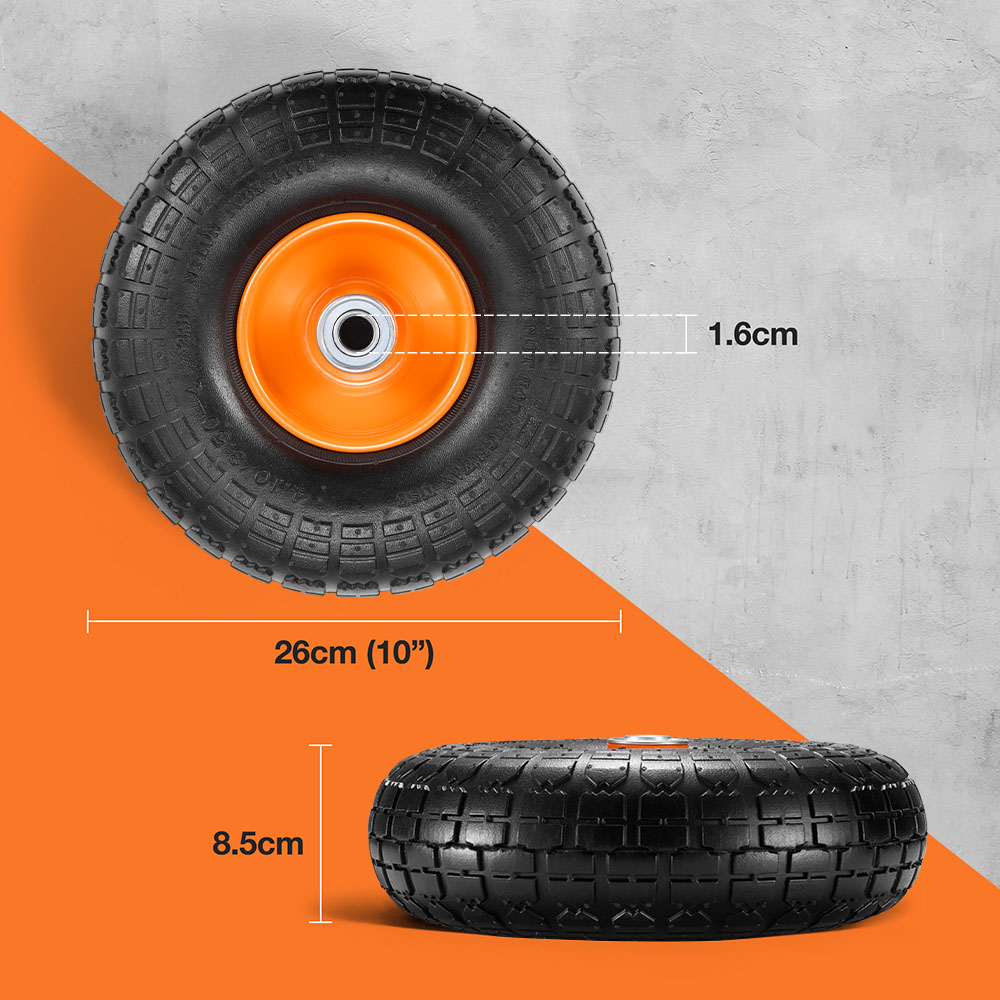 Replace worn wheels on your VonHaus Garden Trolley Cart with this 4 pack of pneumatic wheels. Pneumatic wheels can absorb unevenness of terrain. Suitable for use with the VonHaus Garden Trolley Cart and most trollies, carts and hand trucks. (check specification before purchase)Tyre diameter: 10”Tyre width: 3” (bore size 16mm). – 10” Spare Pneumatic Wheels 4 Pack – DIY – Garden Tools – VonHaus