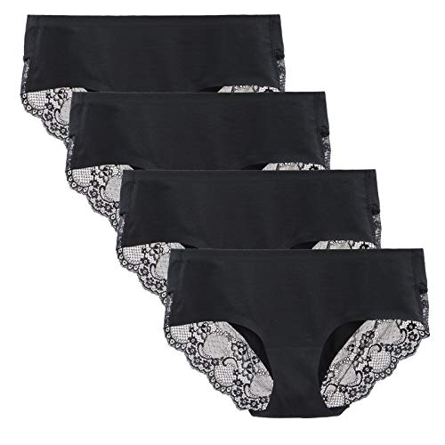 Women’s Seamless Knickers Cotton Lady Panties Midi Lace Underwear Full Coverage Brief Pack of 4 M Black