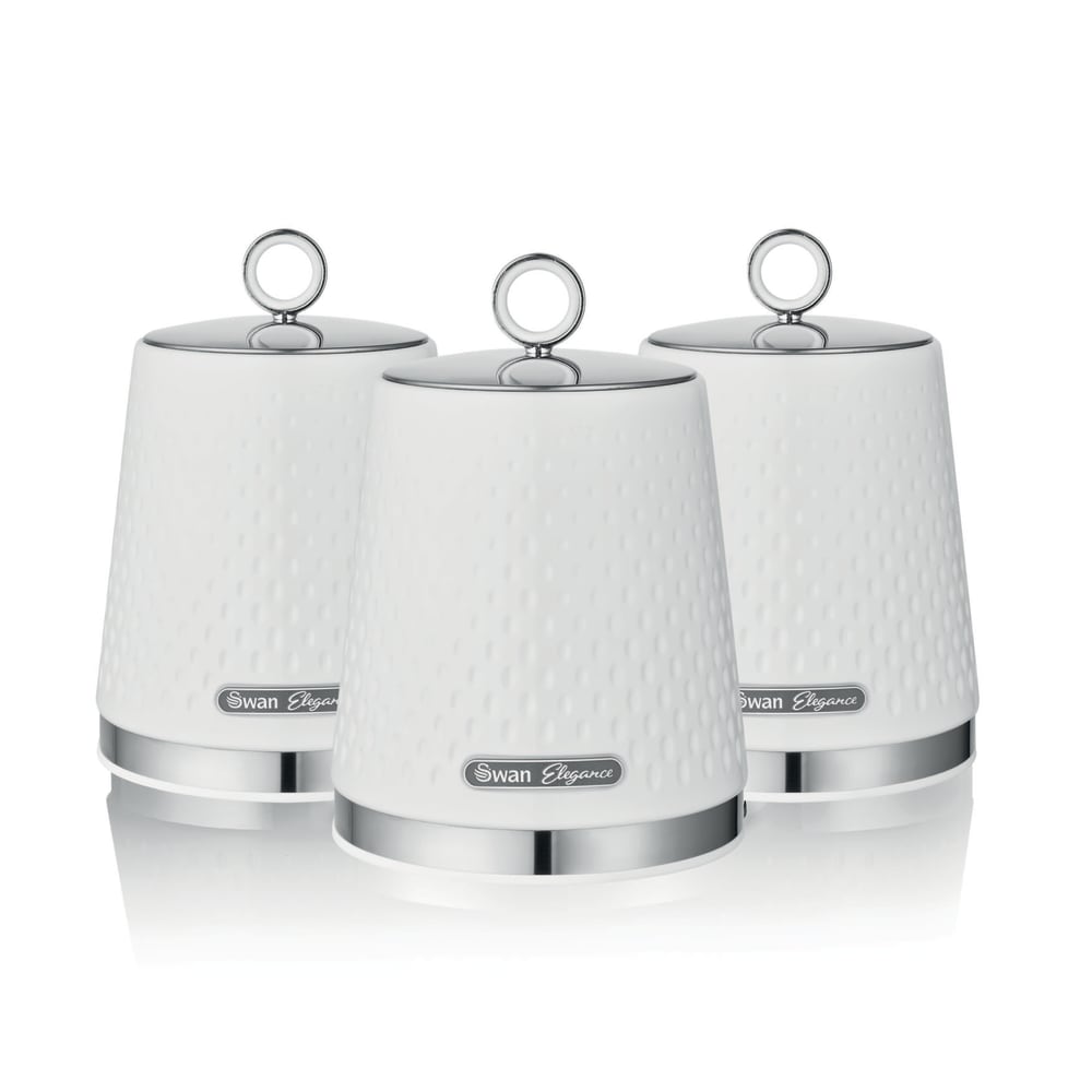 Elegance Set of 3 Canisters ELEGANT KITCHEN STORAGE Combining practicality with an elegant design, these 3 storage canisters are a perfect addition to any kitchen. CANISTERS FOR YOUR EVERYDAY ITEMS These canisters are a great multi-purpose storage solution. Keep your teabags, coffee, sugar or other loose ingredients stored on your worktop, with the airtight lids locking in the freshness. They also feature non-slip bases to protect your worktop from scratches. LARGE 1.3 LITRE CAPACITY Store large quantities of teabags, sugar, coffee and more. Perfect for a busy household. LOOP LID FOR EASY ACCESS The mirror finish stainless steel lid features a round loop pull up handle for easy access. CARE INSTRUCTIONS Requires just a simple wipe with a cloth to clean and maintain the glossy finish. ELEGANCE COLLECTION The Swan Elegance collection features a contemporary gloss textured finish with chrome accents. Add your own unique style to your kitchen. 2 YEAR GUARANTEE These storage canisters come with a 1 year manufacturer’s guarantee with an additional 1 year when you register the product. AN ESTABLISHED LIFESTYLE BRAND Celebrating style, innovation & high-quality design since the 1920s, Swan is a fixture in homes across the globe. We love what we do. Whether it’s helping make the perfect drink, entertaining friends & loved ones or ensuring your home looks its best – we are a lifestyle brand for everyday moments. Our pieces combine traditional & contemporary design with outstanding performance, all backed up by dependable service. Introduce the Swan Elegance set of 3 white storage canisters to your everyday kitchen collection. Each canister features a 1.3 litre capacity, letting you store large amounts of tea, coffee, sugar or other loose ingredients on your kitchen worktop, all while protecting the contents from dust or moisture. The lids include large sturdy steel loops to grip comfortably, providing you with easy access to the contents. All canisters have non-slip feet for added stability and to protect your worktop from scratches. These kitchen canisters combine practicality with an elegant design, offering a contemporary colour scheme to fit perfectly amongst any kitchen décor. The canisters form part of the Swan Elegance breakfast and storage collection. Swan has been providing high-quality household appliances and kitchenware to millions of homes across the UK for over 100 years.
