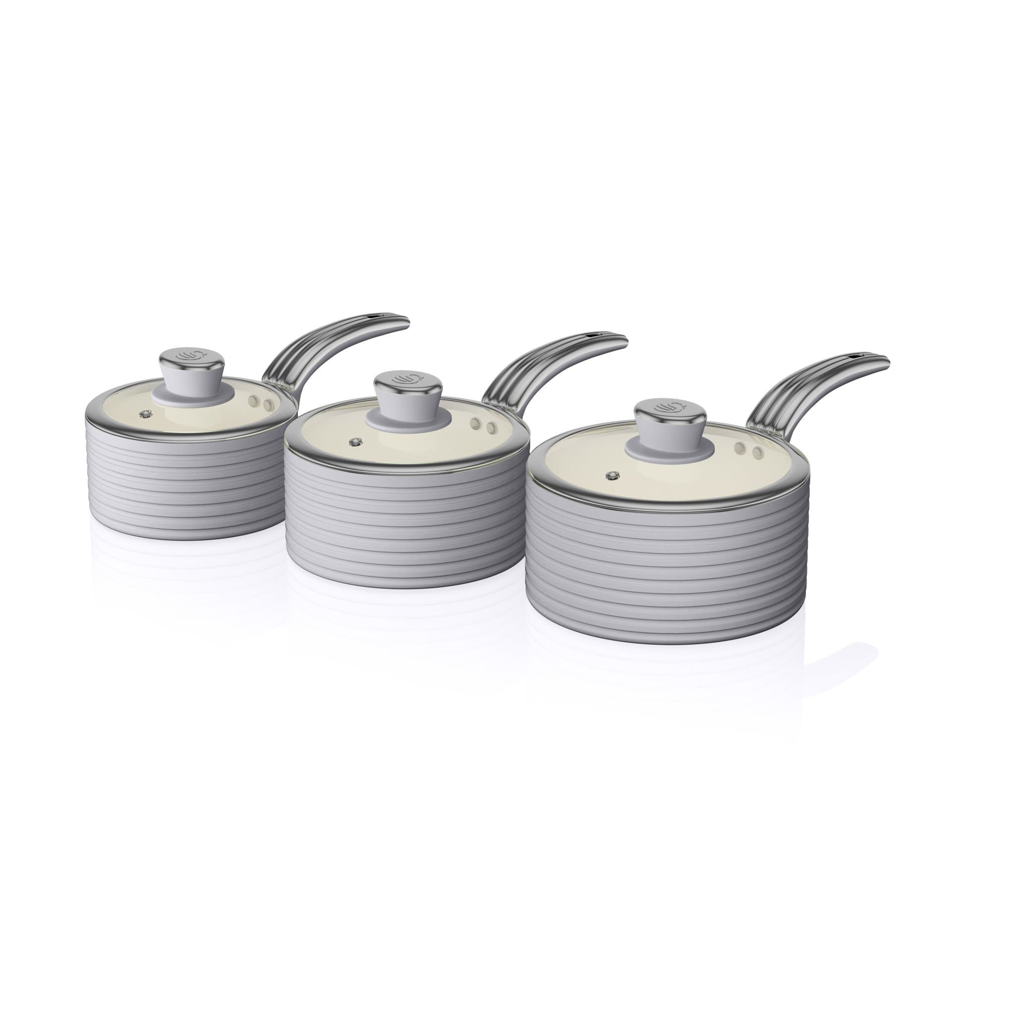 Create delicious home cooked meals for one or all the family with the Retro 3 Piece Saucepan Set. Comprising of 16, 18 and 20cm saucepans, this set is perfect for boiling pasta, potatoes and vegetables with ease, making it perfect for one or all the family. Featuring an ivory ceramic non-stick inner coating, each saucepan requires little to no oil, enabling a healthier cook and an easier clean. Constructed from 3mm thick pressed aluminium, each saucepan is built to stand the test of time whilst Bakelite soft touch stay-cool handles offer comfort and control during use. Suitable for all hob types including induction, each saucepan requires only a simple hand wash to maintain its optimum performance. Complete with glass lids featuring a stylish Swan embossed handle and beautiful rib designed body, this Retro 3 Piece Saucepan Set makes both a practical and stylish addition to your kitchen.
