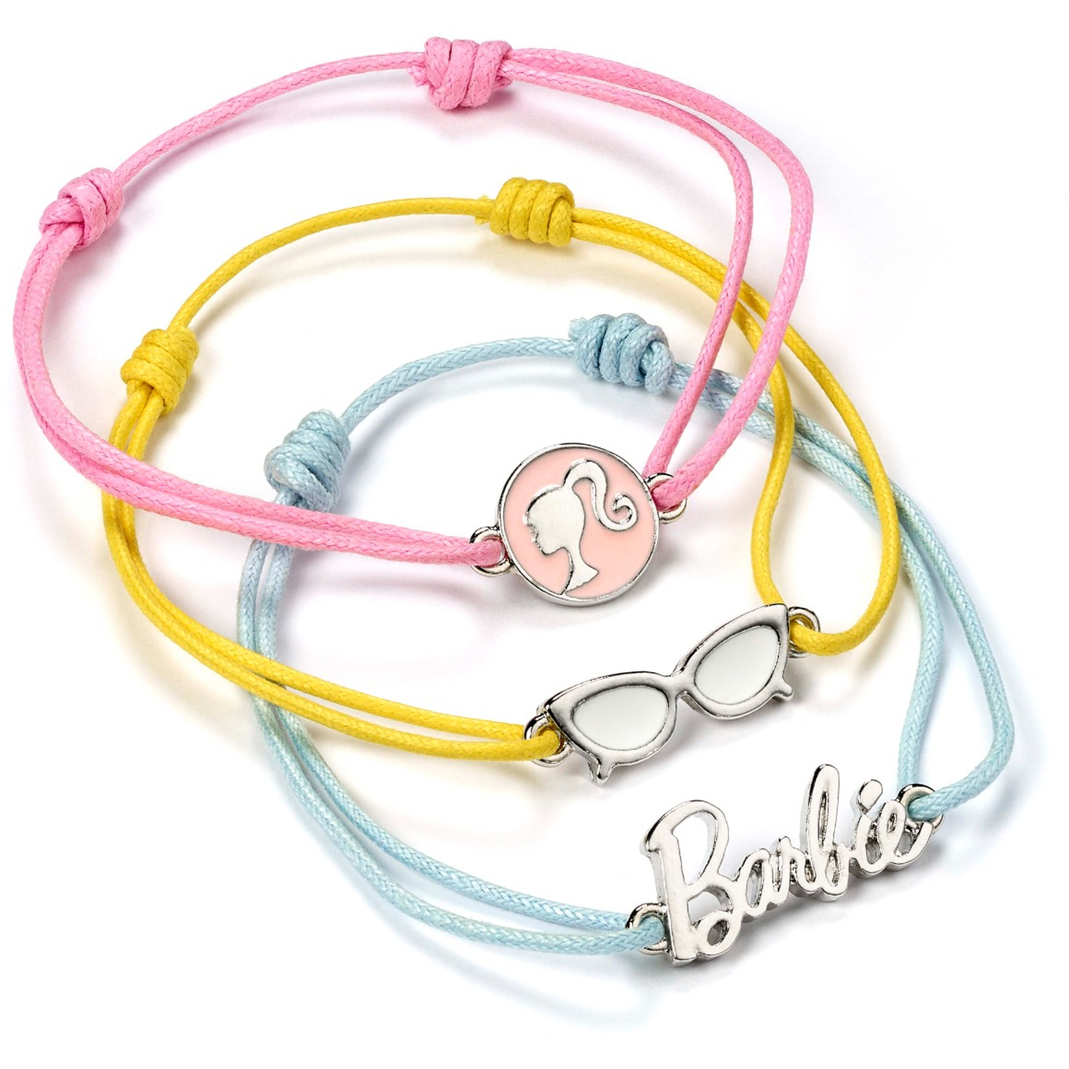 Set of three Barbie Friendship Bracelets each one has a different charm true to Barbie. Her logo, silhouette and glasses on adjustable cord bracelets of pink, white and blue. Wear these friendship bracelets stacked together or swap with friends. If there's one thing Barbie is about, it's making sure her friends are happy. Part of an official jewellery collection for age 14 and up. Make sure your friends know they're never alone with these friendship bracelets and show off your loyalty in style.